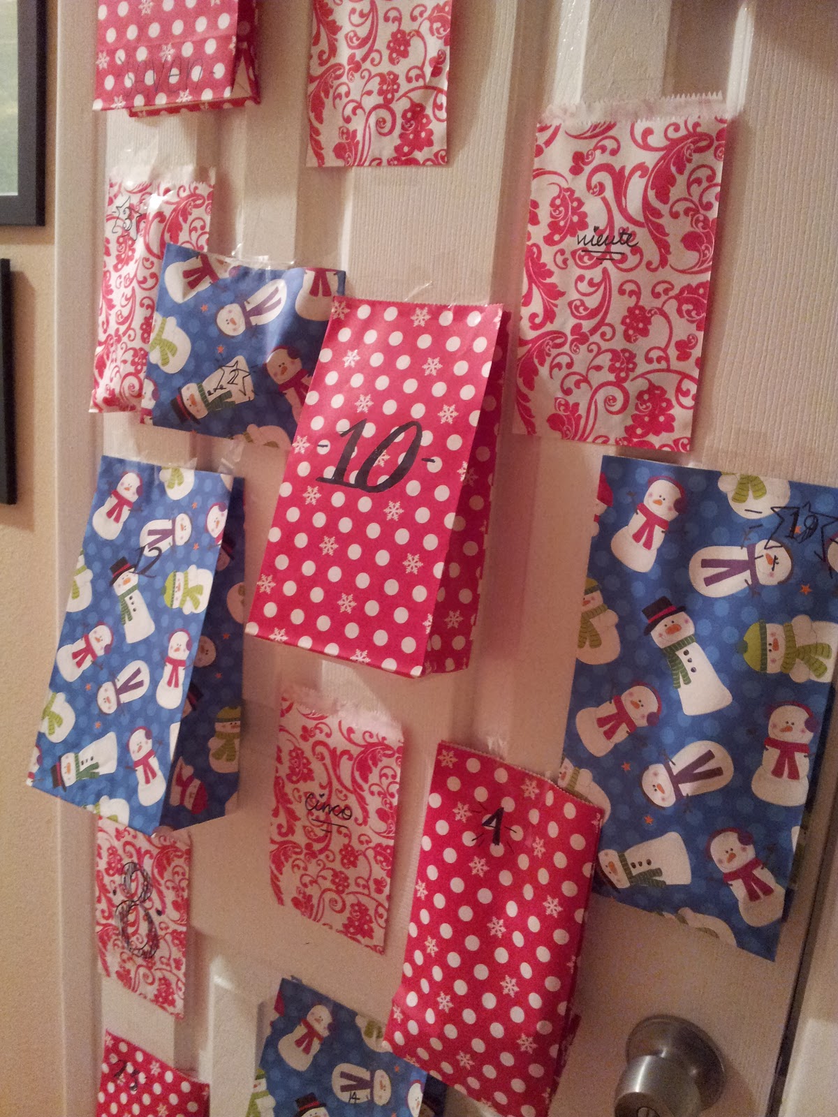 I actually got my vision up and going...using different xmasy gift bags and sacks..I filled each with a goodie..and and activity to complete together...the plan was to affix them on the wall forming a tree...and it was taking shape...when I realized that a certain RASCALLY dog named Bear was sniffing around...and I realized that he for sure would snatch the treats before the kids could....SO PLAN B...I kept the bags and insides the same and just strung them up on twine instead...OUT OF THE WAY....and still looks really cute!